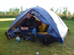 DSC01087 Mark cooking dinner from tent in rain